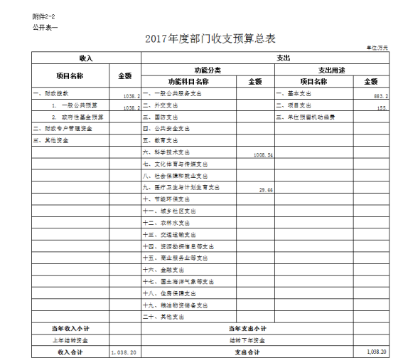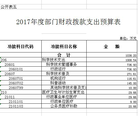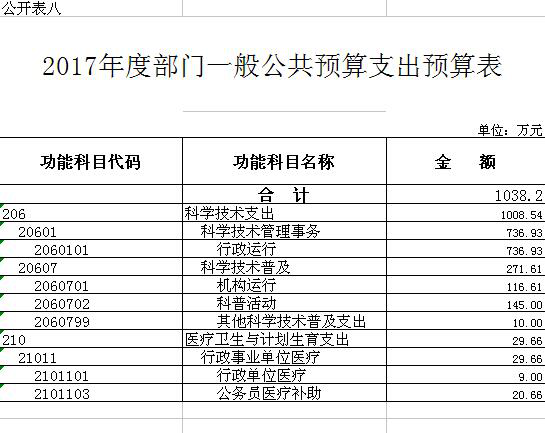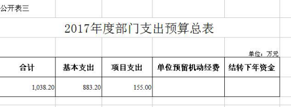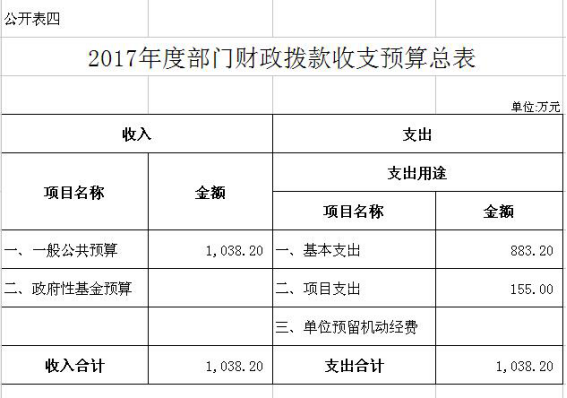 本部門2017年度財政撥款收、支總預算  1038.2 萬元。與上年相比,財政撥款收、支總計各增加  117.47 萬元,增長 12.7   %。主要原因是調資后工資福利增加及提租補貼提高
