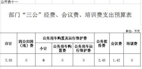 本部門2017 年度一般公共預算撥款安排的“三公經費預算支出中,因公出國(境)費支出 0   萬元,占“三公經費的   0  %;公務用車購置及運行費支出  0  萬元,占“三公經費的 0   %;公務接待費支出 2.45   萬元,占“三公經費的  100   %。具體情況如下: