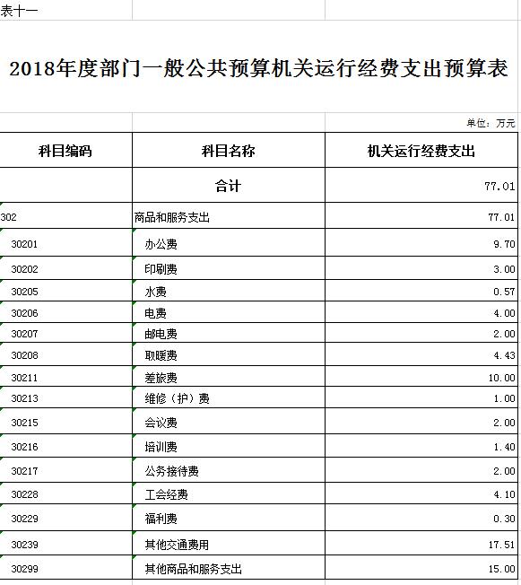 2018年本部門一般公共預(yù)算機(jī)關(guān)運(yùn)行經(jīng)費(fèi)預(yù)算支出 77.01 萬元,與上年相比減少 53.51 萬元,降低 41 %。主要原因是:今年對(duì)自收自支事業(yè)單位經(jīng)費(fèi)從此項(xiàng)剔除。