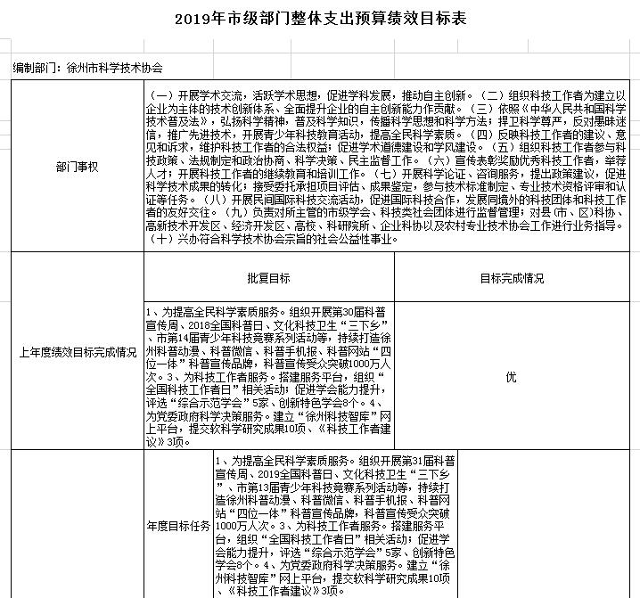 2019年市級部門整體支出預算績效目標表