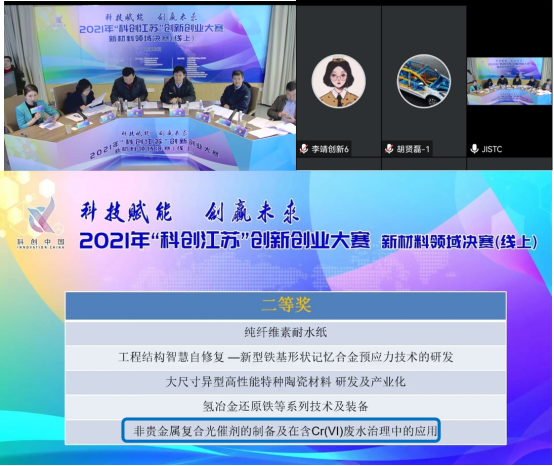 由省科協(xié)、省工信廳等六部門(mén)聯(lián)合主辦的“科創(chuàng)江蘇”創(chuàng)新創(chuàng)業(yè)大賽決賽于 12 月 13 日以線上形式在無(wú)錫舉行,徐州市科協(xié)推薦的《非貴金屬?gòu)?fù)合光催劑的制備及在含Cr(VI)廢水治理中的應(yīng)用》課題榮獲創(chuàng)新組二等獎(jiǎng)。