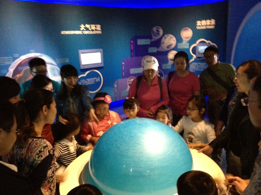 家長帶領(lǐng)孩子在參觀氣象科普場館
