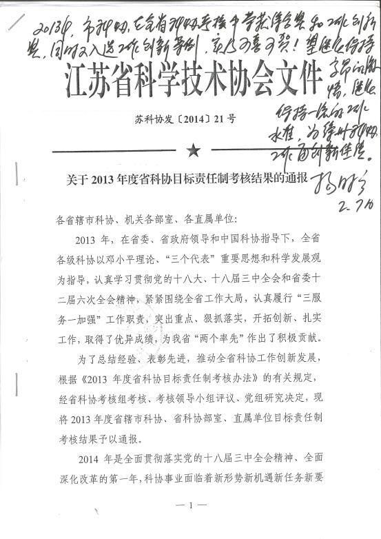 2013年,徐州市科協(xié)在全省科協(xié)系統(tǒng)目標(biāo)責(zé)任考核中被評為優(yōu)秀等次,同時,再次榮獲綜合工作先進(jìn)單位及單項(xiàng)工作創(chuàng)新獎。優(yōu)秀等次、綜合獎和單項(xiàng)獎同時獲得的只有2個城市,徐州是其中之一。