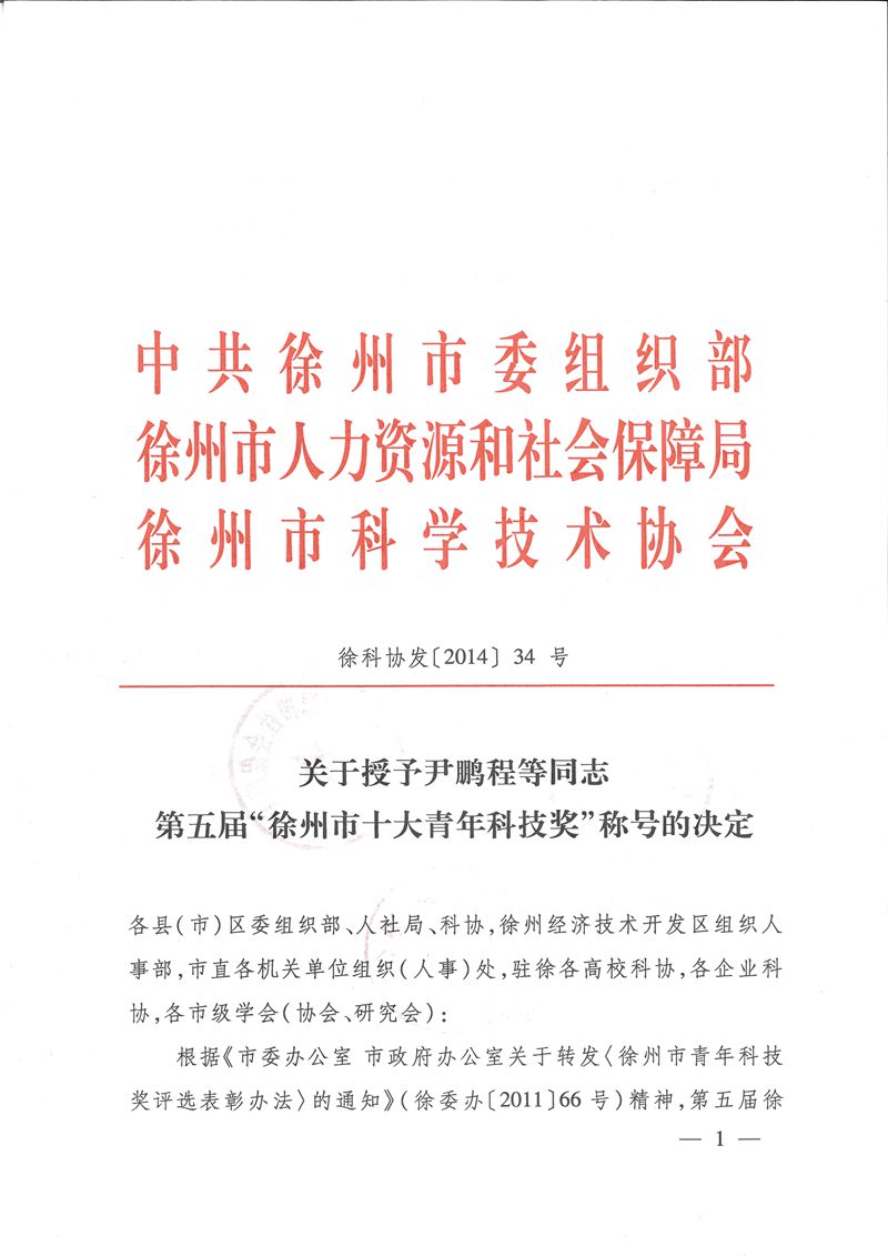 7月14日,由江蘇省徐州市委組織部、市人力資源和社會保障局、市科協(xié)等單位聯(lián)合組織評審的第五屆“徐州市十大青年科技獎”評選揭曉,決定授予尹鵬程等10位同志第五屆“徐州市十大青年科技獎”稱號。