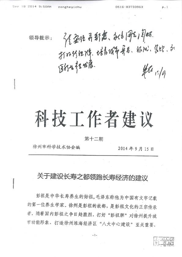 9月17日徐州市市長朱民對市科協(xié)上報的“關(guān)于建設(shè)長壽之都領(lǐng)跑長壽經(jīng)濟(jì)的建議”作出重要批示:“請安順并彩霞、永信同志閱研,打好彭祖牌,培育我市養(yǎng)老、旅游、餐飲和醫(yī)療等產(chǎn)業(yè)發(fā)展”。