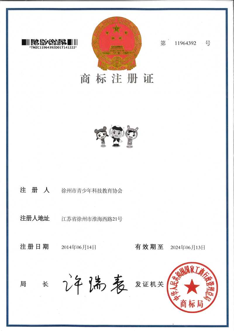 商標(biāo)注冊(cè)證     經(jīng)過兩年審查,徐州市科協(xié)向國家工商總局申請(qǐng)的徐州市科普動(dòng)漫人物商標(biāo),于去年6月被正式批準(zhǔn),并于2015年2月3日正式拿到了注冊(cè)證。自此,徐州市科協(xié)將持有使用小問號(hào)、愛思考和小百科三個(gè)動(dòng)漫人物10年的專屬權(quán)利。