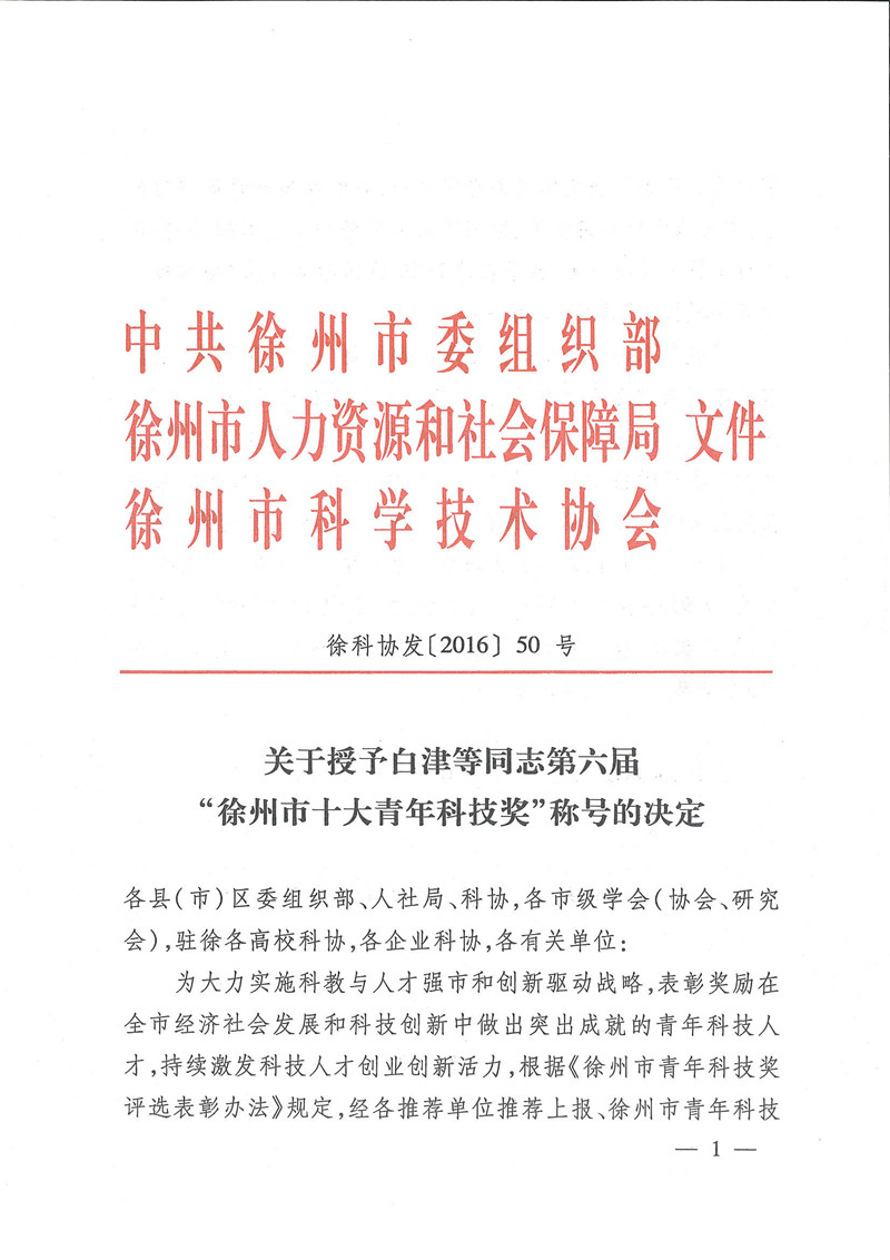 7月8日,第六屆“徐州市十大青年科技獎”評選揭曉,徐州醫(yī)科大學(xué)白津等10位同志獲第六屆“徐州市十大青年科技獎”稱號。