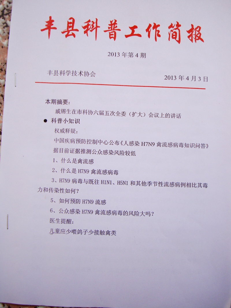 豐縣科協(xié)針對(duì)H7N9禽流感來(lái)襲,借助報(bào)紙、電視、手機(jī)短信、科普工作簡(jiǎn)報(bào)等多種宣傳平臺(tái)大力普及禽流感的預(yù)防科普知識(shí)??h科協(xié)從什么是禽流感;什么是H7N9禽流感病毒;H7N9病毒與既往H1N1、H5N1和其他季節(jié)性流感病例相比其毒力和傳染性如何;如何預(yù)防H7N9流感;公眾感染H7N9禽流感病毒的風(fēng)險(xiǎn)大嗎等幾個(gè)方面,采用通俗易懂的語(yǔ)言對(duì)相關(guān)知識(shí)進(jìn)行了普及。通過(guò)普及宣傳清除了公眾對(duì)H7N9禽流感的恐懼,掌握了預(yù)防的方法,堅(jiān)定了依靠科學(xué)戰(zhàn)勝H7N9禽流感的信心。