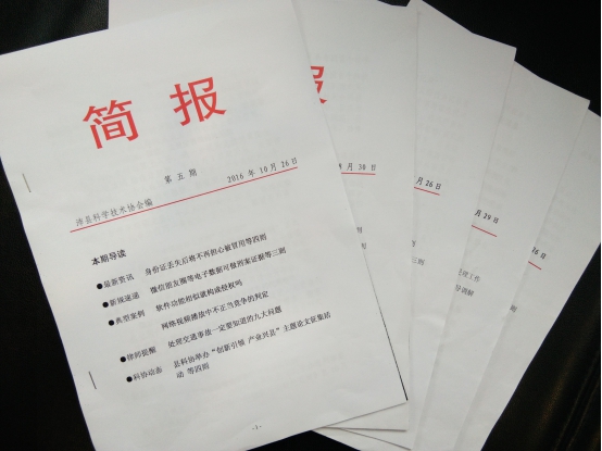沛縣科協(xié)于今年5月推出第一期《簡(jiǎn)報(bào)》,至今已編印了5期。作為一種推介科協(xié)影響力、便于上級(jí)和同級(jí)單位了解科協(xié)工作情況、溝通科協(xié)信息的有效手段,為做好《簡(jiǎn)報(bào)》的印發(fā)工作,沛縣科協(xié)從人員配備到材料準(zhǔn)備上都做了大量工作。《簡(jiǎn)報(bào)》立足于本單位工作,考慮科技工作者需求,突出科普新知識(shí)傳發(fā),內(nèi)容側(cè)重網(wǎng)絡(luò)時(shí)代科普新知識(shí)的掌握和應(yīng)用,突出縣科協(xié)當(dāng)月工作足績(jī)和成效,及時(shí)報(bào)導(dǎo)我縣科協(xié)系統(tǒng)工作取得的成績(jī),增加了科協(xié)知曉力,凝聚了科協(xié)戰(zhàn)線工作者向心力,對(duì)進(jìn)一步做好科協(xié)各項(xiàng)工作起到了積極推動(dòng)作用。沛縣科協(xié)《簡(jiǎn)報(bào)》每期呈報(bào)給分管領(lǐng)導(dǎo),發(fā)送縣發(fā)展改革委員會(huì)、縣農(nóng)業(yè)委員會(huì)、縣科技局等三十多家單位。
