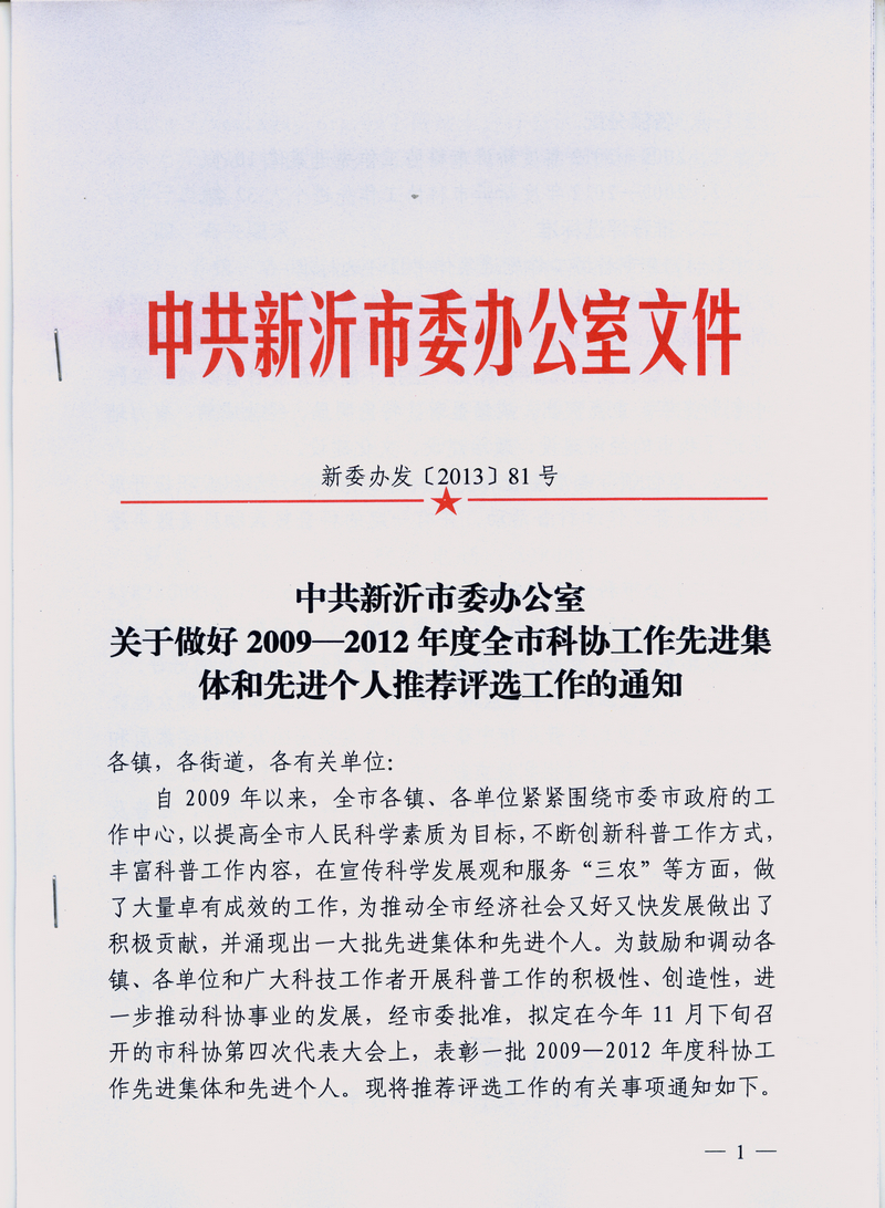 新沂市開展2009—2012年度全市科協(xié)工作先進(jìn)集體和先進(jìn)個人推薦評選活動