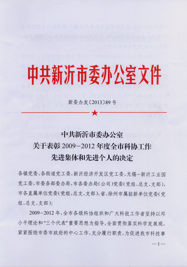 中共新沂市委發(fā)文表彰2009—2012年度全市科協(xié)工作先進(jìn)集體和先進(jìn)個(gè)人