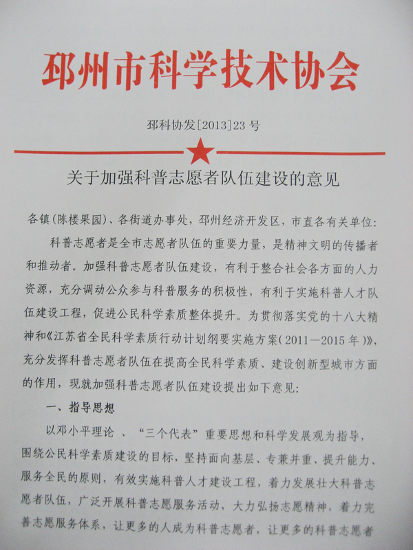 邳州市科協(xié)印發(fā)的《關(guān)于加強(qiáng)科普志愿者隊(duì)伍建設(shè)的意見(jiàn)》
