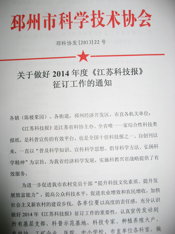 邳州市科協(xié)印發(fā)《關(guān)于做好2014年度<江蘇科技報(bào)>征訂工作的通知》