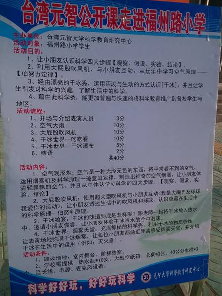 12月4日,臺灣元智“科普萬里行”活動走進邳州市福州路小學,這項活動是由臺灣元智大學科學教育研究中心主辦,以科學秀的形式將科學從生硬的教科書形式變成生動活潑的互動式教學,使科學更加有趣。
