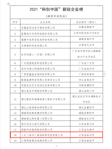 上交(徐州)新材料研究院有限公司入選2021“科創(chuàng)中國” 新銳企業(yè)榜單